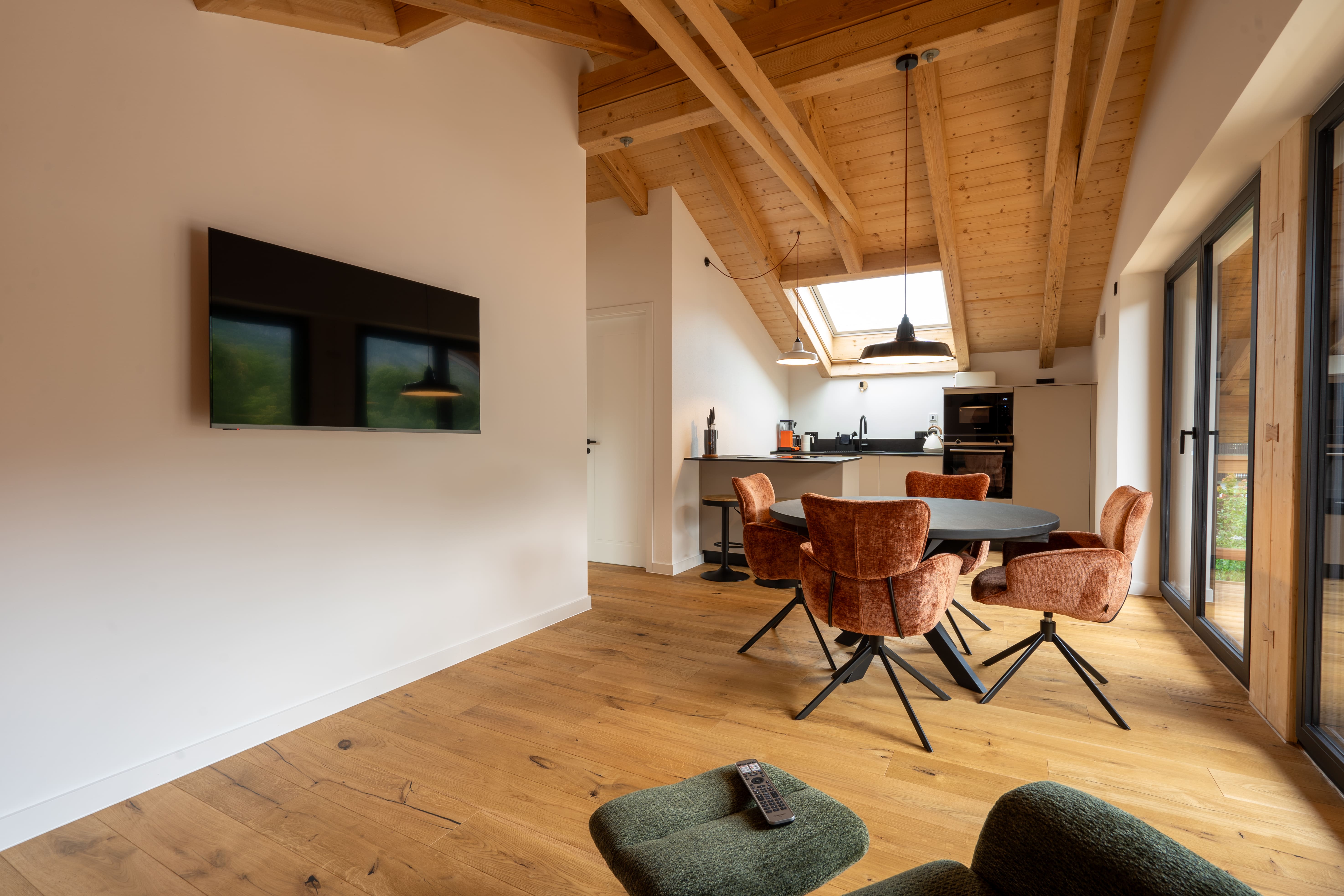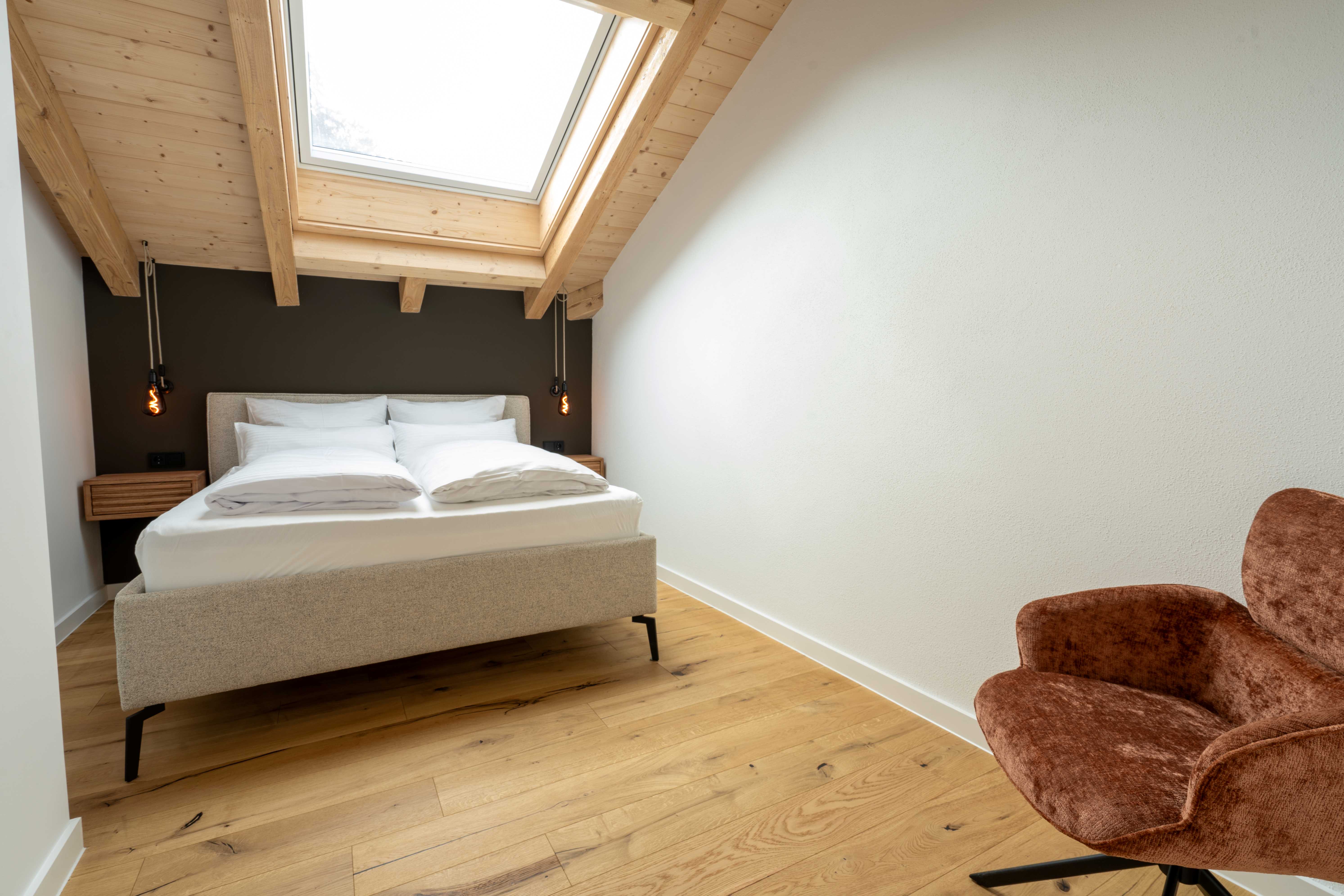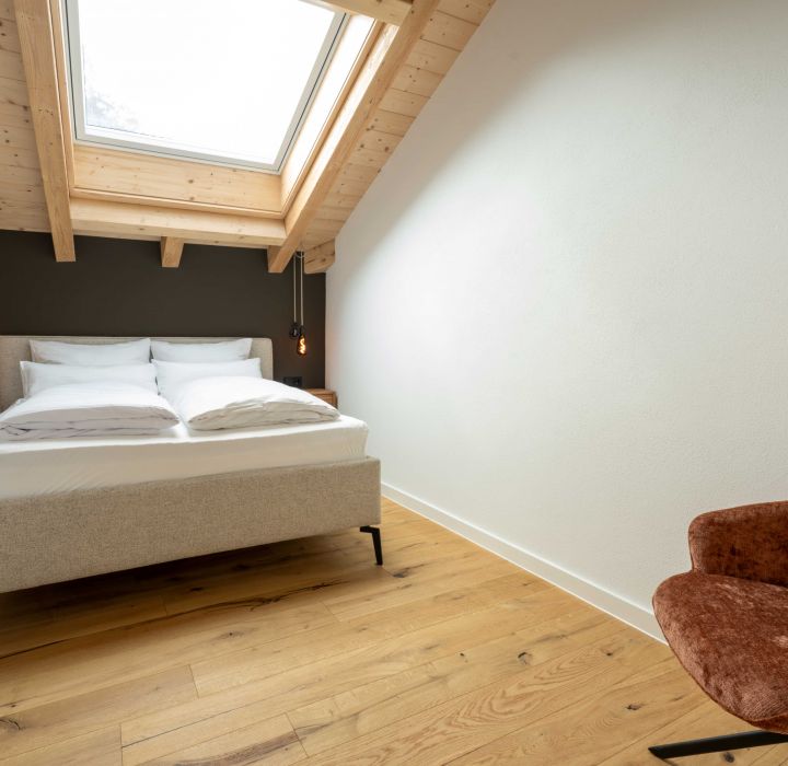 Unsere Ferienwohnung dach & fach, liegt unterm offenen Sichtdachstuhl und verbindet alpinen Charme mit behaglicher Wohnlichkeit.