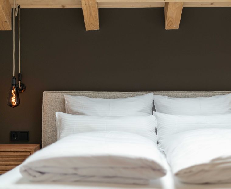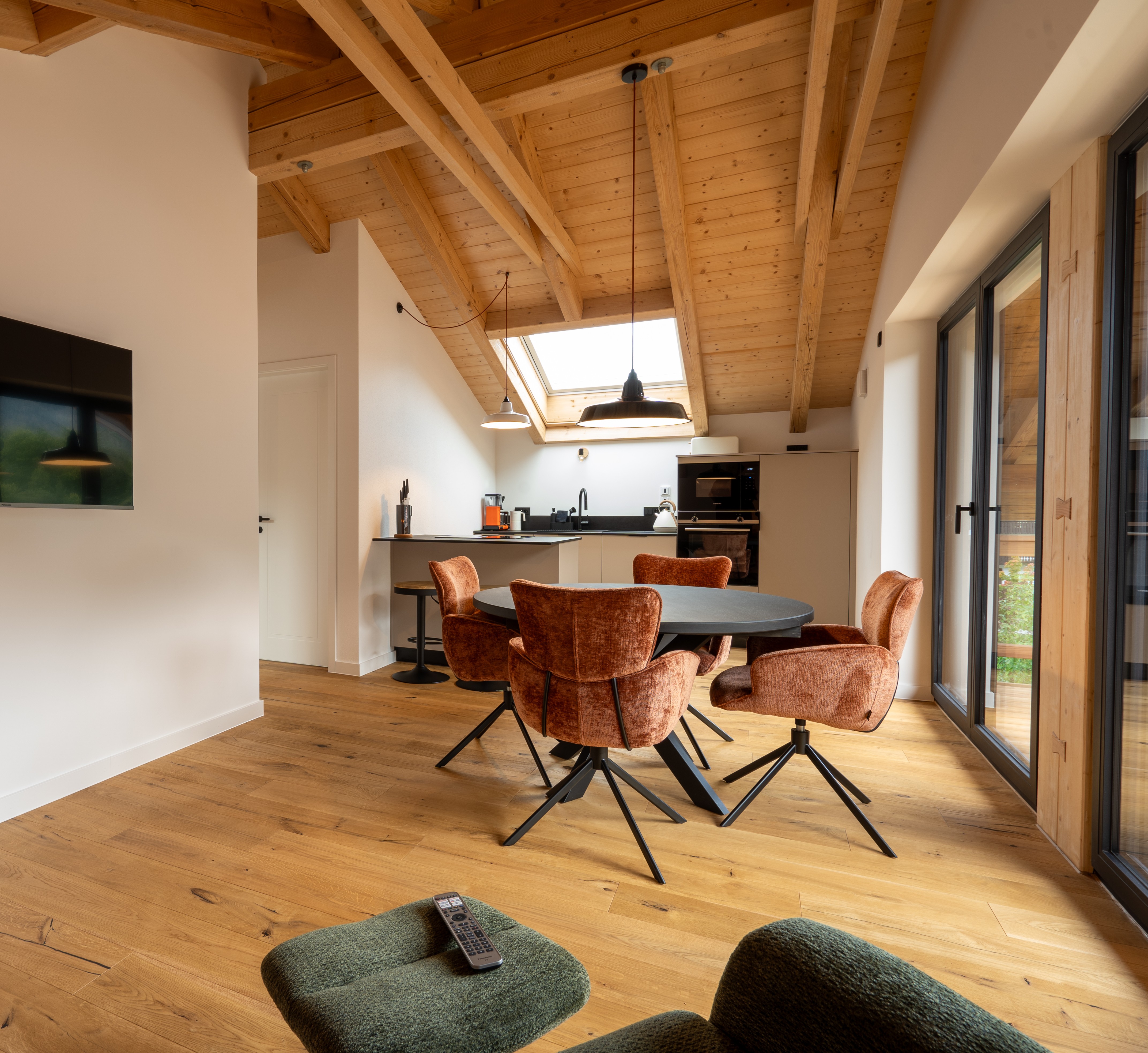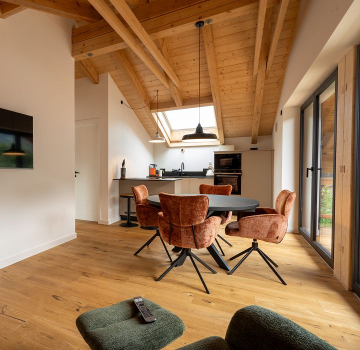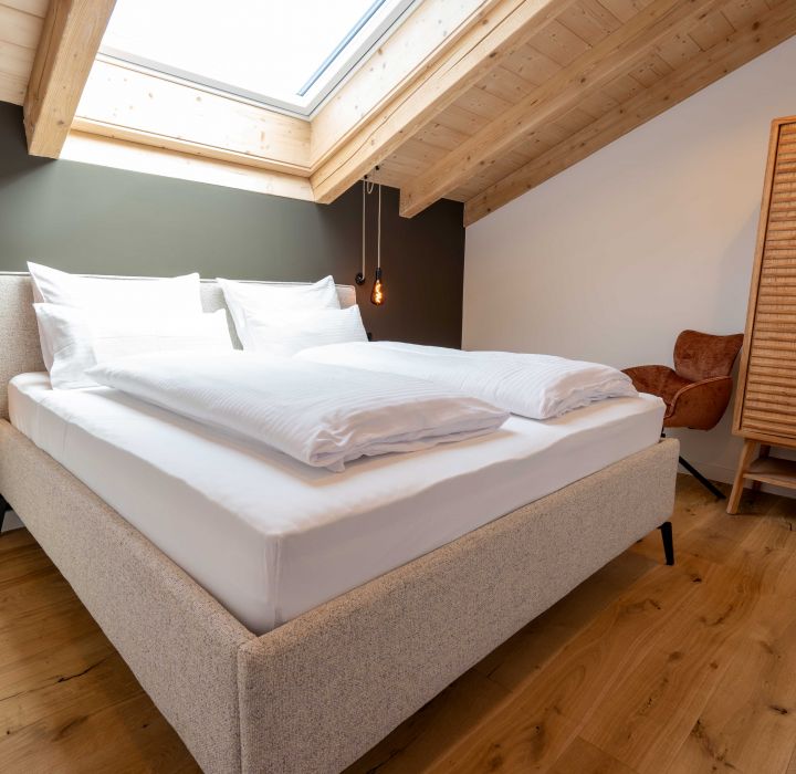Unsere Ferienwohnung dach & fach, liegt unterm offenen Sichtdachstuhl und verbindet alpinen Charme mit behaglicher Wohnlichkeit.
