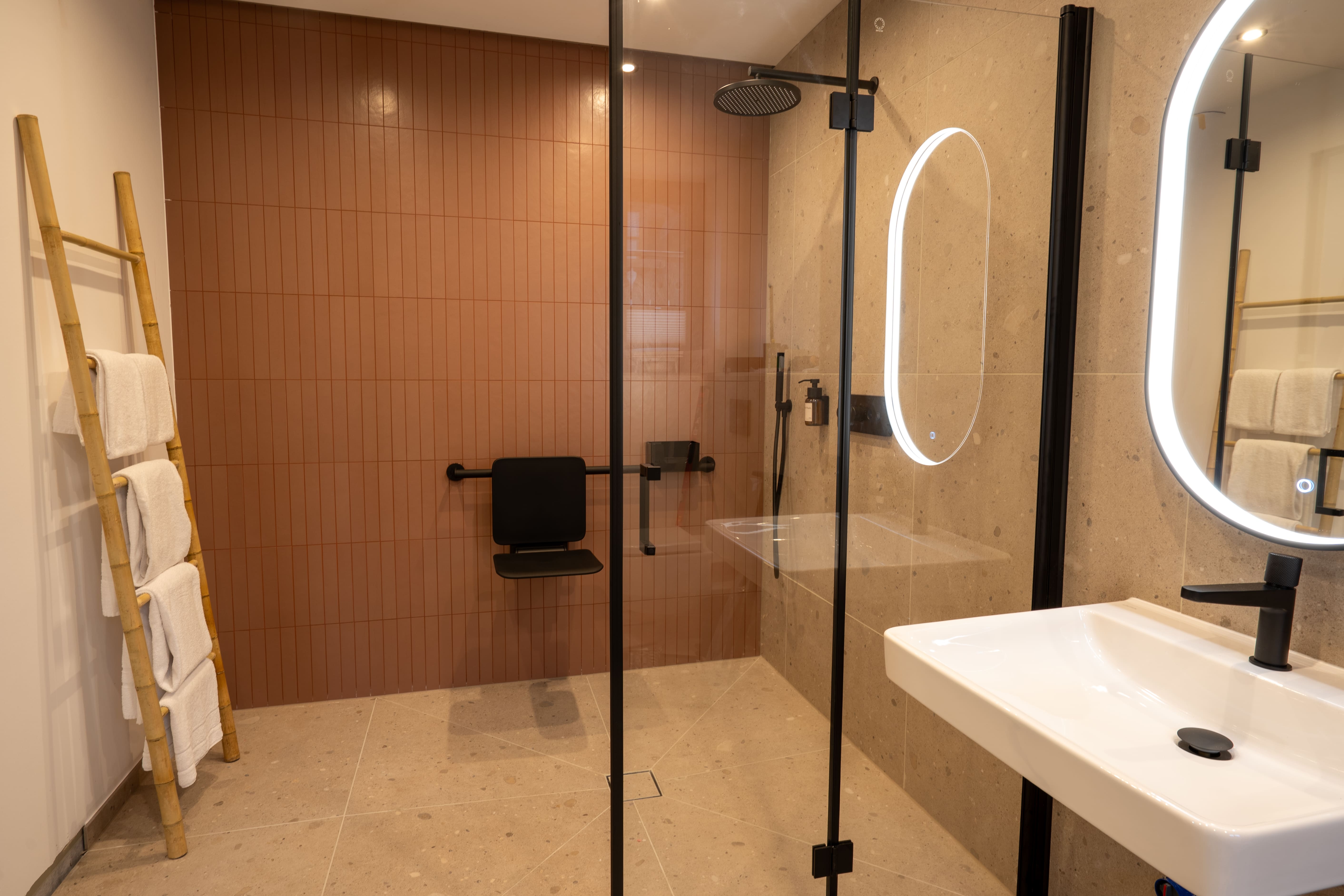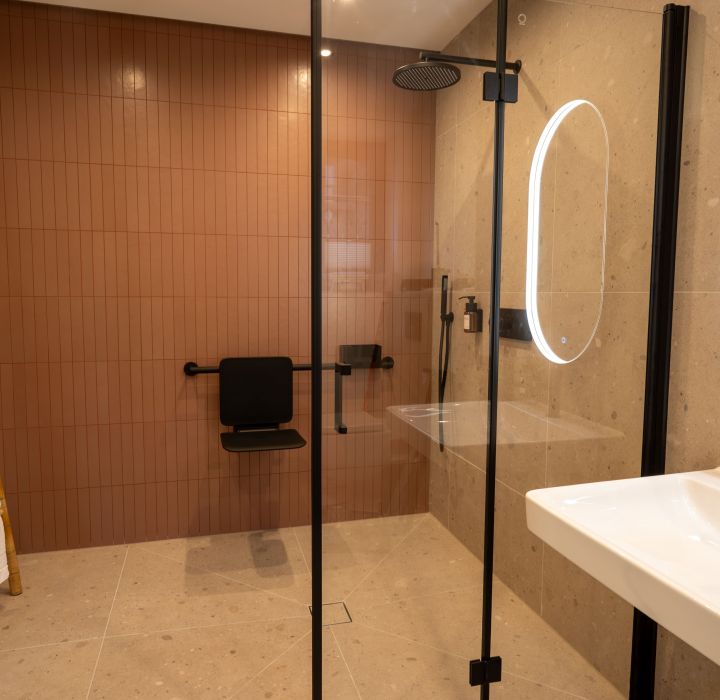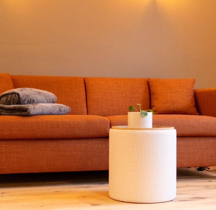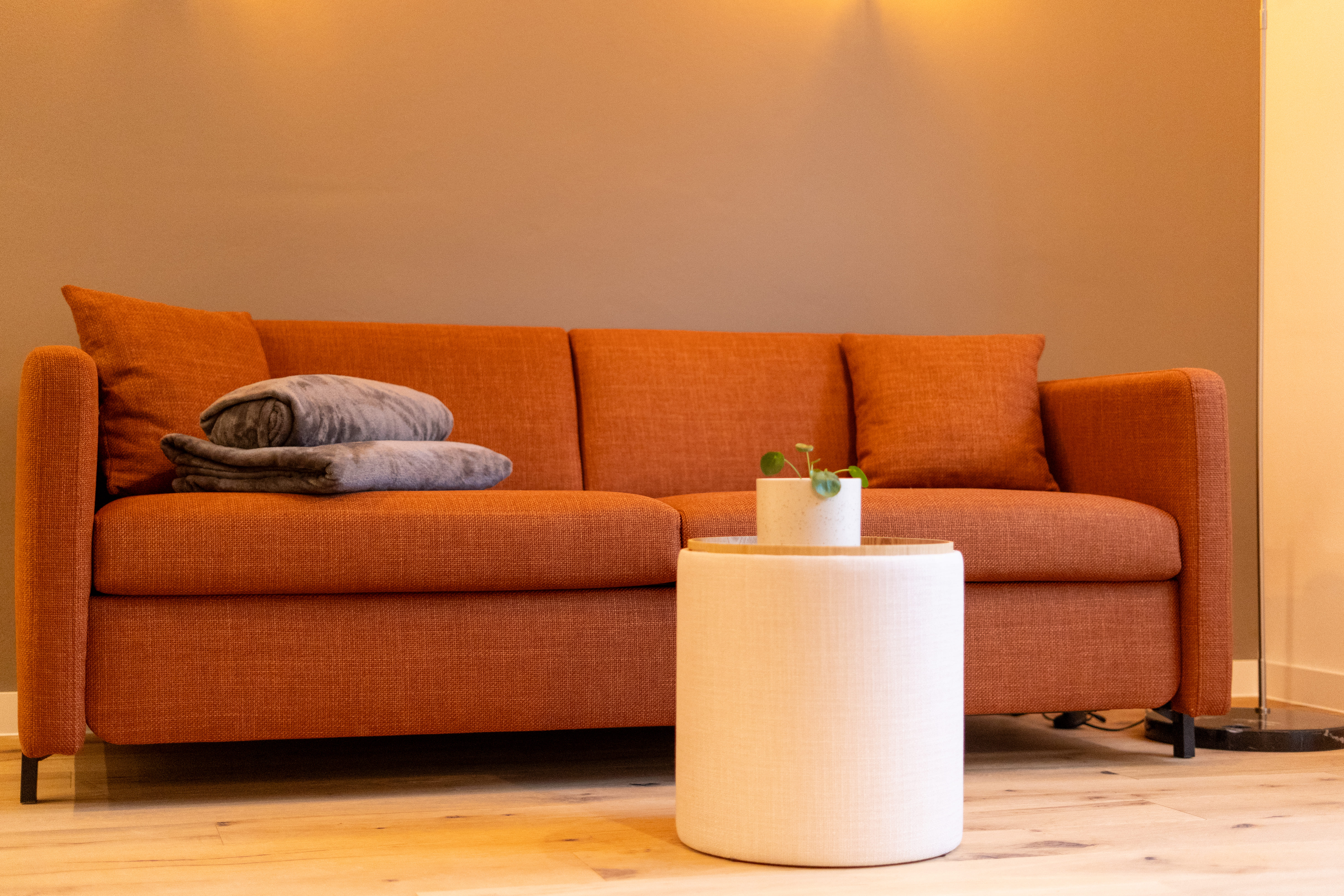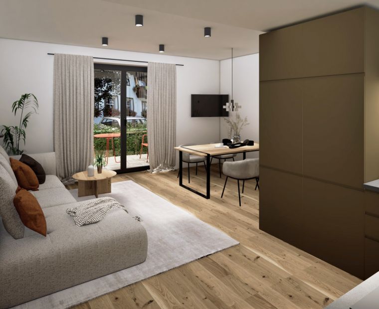 Das weitläufige Wohnzimmer mit komfortabler Schlafcouch bietet zusätzliche Schlafmöglichkeiten und führt auf die private Terrasse – perfekt zum Durchatmen und Verweilen im Freien. Der separate Eingang mit Rampe macht den Zugang besonders bequem.